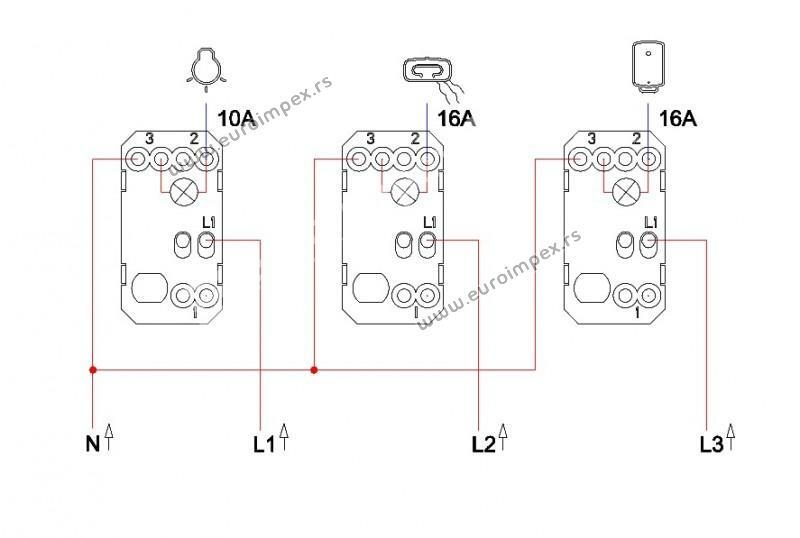 Sklopka za kupatilo sa indikatorom za tri nezavisna kruga 10AX/2 x 16AX 250V~