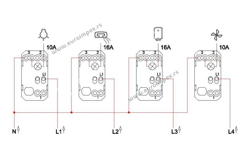 Sklopka za kupatilo sa indikatorom za četiri nezavisna kruga 10AX/2 x 16AX/10AX 250V~
