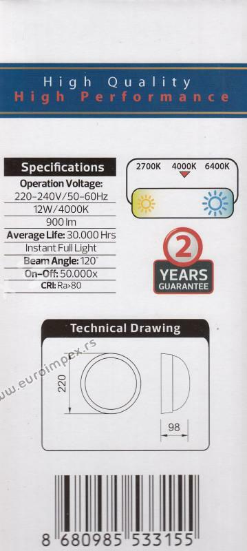 LED SPOLJNA (brodska) LAMPA 12W 4000K IP54 OKRUGLA