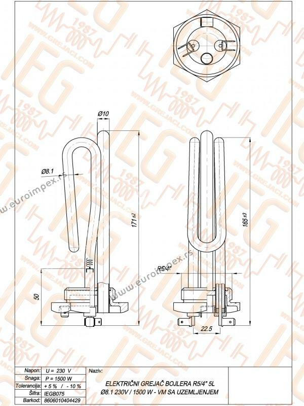cevni grejač bojlera R5/4" 5L VM sa uzemljenjem Cu Ø8.1mm ~ 230V 1500W sonda Ø10/Ø9 L=160mm
