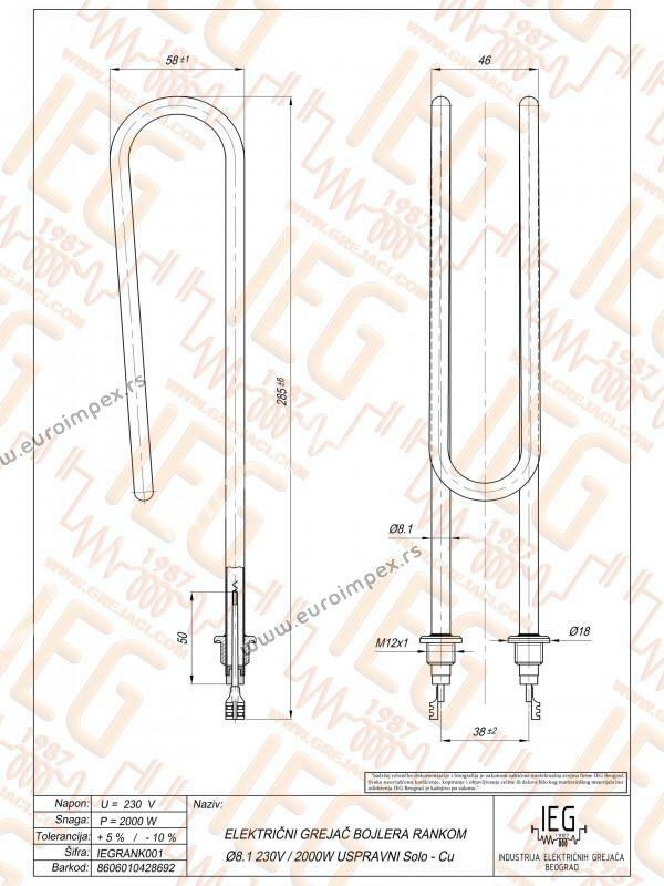 GREJAČ BOJLERA USPRAVNI SOLO RANKOM i Gold Leon sa zenskim buksnama za ubodni termostat Cu fi8,1 230v 2000W IEGRANK001