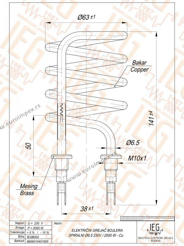 GREJAČ ZA BOJLER 2000W SPIRALNI fi 6,5 Cu IEGB002