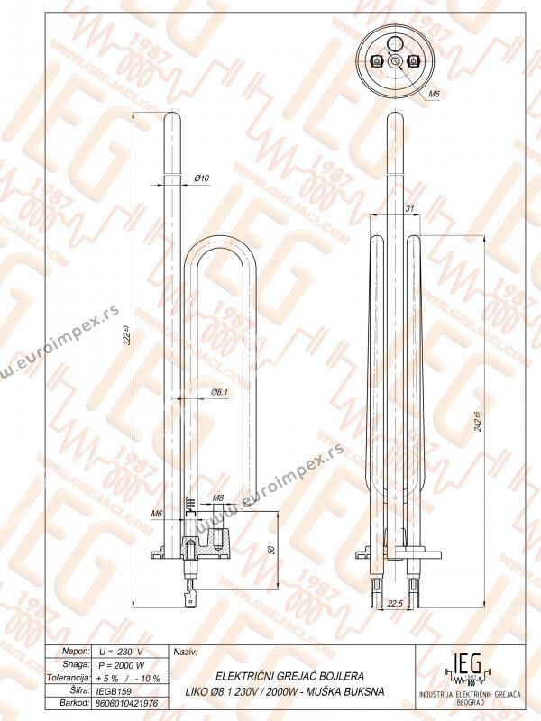 GREJAC ZA BOJLER 2000W TERMORAD LIKO PRODUZENI fii8,1 Cu MUSKE BUKSNE SA NOSACEM ANODE M8 sonda fi10/fi9 l=290mm IEGB159