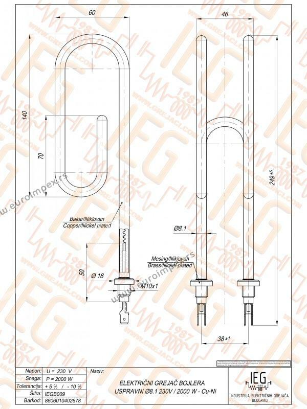 El. cevni grejač bojlera USPRAVNI Cu/Ni Ø8.1mm ~ 230V 2000W