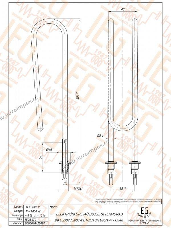 IEGB270 El. cevni grejač bojlera TERMORAD BTC/BTCR uspravni produženi Cu/Ni Ø8.1mm ~ 230V 2000W nazubica M12