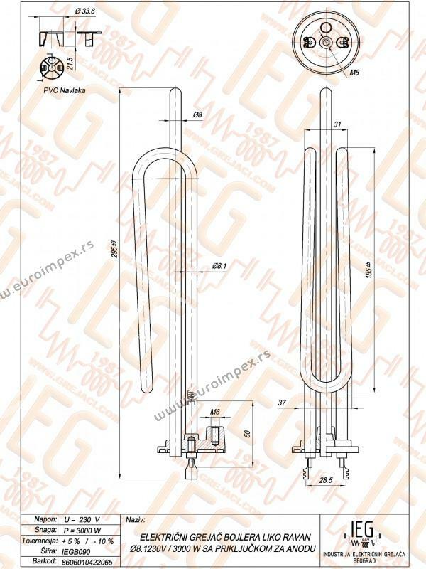 El. cevni grejač bojlera LIKO propušten sa nosačem anode M8 TERMORAD Cu Ø8.1mm ~ 230V 2000W sonda Ø8/Ø7 L=290mm