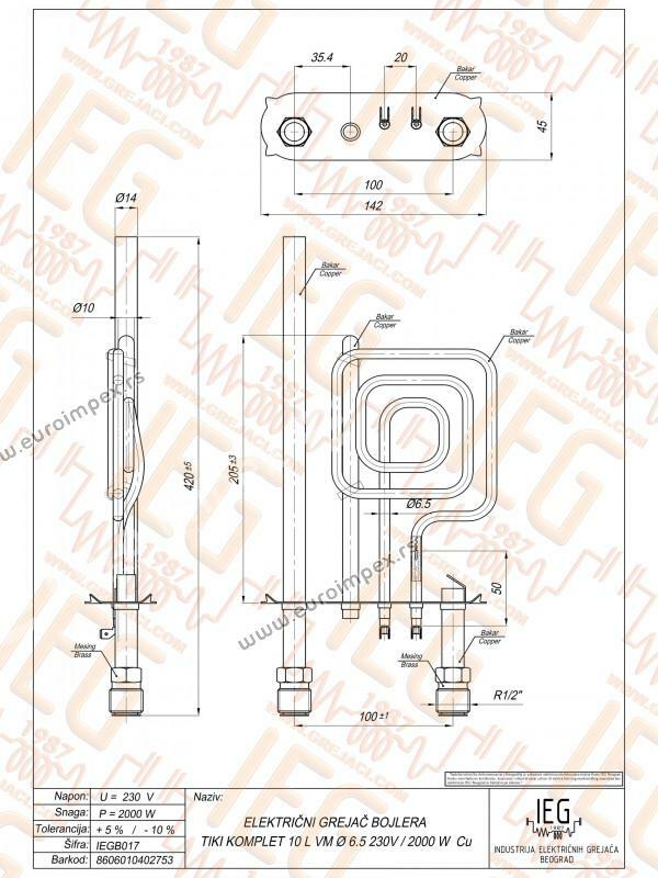 IEGB017 El. cevni grejač bojlera TIKI komplet 10L VM Cu Ø6.5mm ~ 230V 2000W sonda Ø10/Ø9 L=220mm