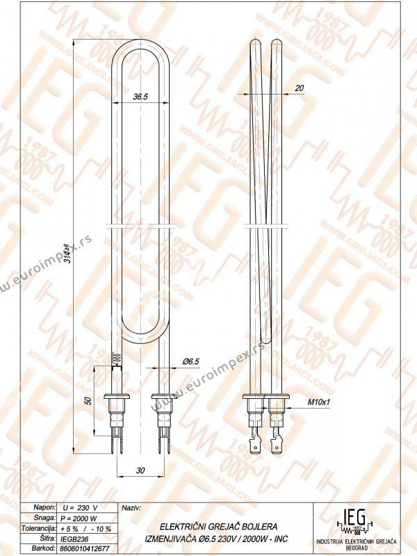 IEGB236 El. cevni grejač bojlera IZMENJIVAČA TOPLOTE Incoloy Ø6.5mm ~ 230V 2000W Inox nazubica