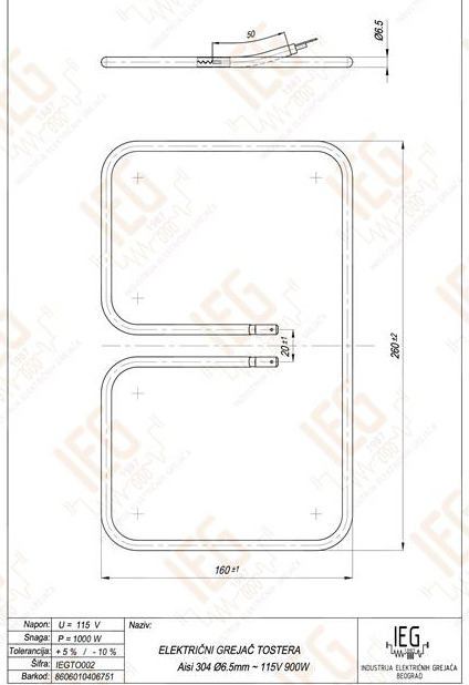 GREJAC TOSTERA 115V 900W fi6,5mm Aisi 304 IEGTO003